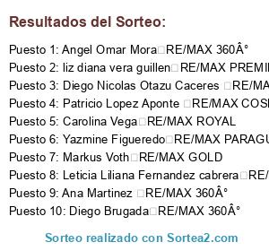 Lista de participantes: Silvana Villalba RE/MAX PROGRESS, Markus Voth RE/MAX GOLD, Ingrid Godoy RE/MAX TERRAMAX, Angeles Bogado RE/MAX ULTRA, Veronica Piris RE/MAX ROYAL, Yazmine Figueredo RE/MAX PARAGUAY, Cecilia piffaretti RE/MAX ELITE, Carolina Vega RE/MAX ROYAL, Ricardo Mauricio Franco Blacutt RE/MAX FENIX, Diego Brugada RE/MAX 360°, Saba Margarita Meza RE/MAX CAPITAL, Norma Ramos RE/MAX PREMIER, Raul Araujo RE/MAX ROYAL, Miguel Gonzalez RE/MAX SOL, Maia Benitez RE/MAX PREMIER, Camila Abigail otazu Caceres RE/MAX ROYAL, Cynthia Rojas RE/MAX PARAGUAY, Fatima Gonzalez RE/MAX ROYAL, Analia Molina RE/MAX SOL, Vilma Vera RE/MAX PRIMICIAS, Felix Caceres RE/MAX FAMILY, Luis Carlos Mendoza Espinola RE/MAX PROGRESS, Alejandro Rodri¬guez RE/MAX SOL, Estela Gonzalez RE/MAX ROYAL, Ada Estefania Traversi Avalos RE/MAX HABITAT, Guillermo Lucas Emanuel Britez Benegas RE/MAX SOL, Natalia Cuevas RE/MAX CAPITAL, Leticia Liliana Fernandez cabrera RE/MAX ROYAL, Ingrid Evers RE/MAX FORCE, Stella Maris Lird RE/MAX PREMIER, Ivanna Ocampos RE/MAX PRIMICIAS, Angel Omar Mora RE/MAX 360°, Carolina galeano RE/MAX FORCE, Tania Irala RE/MAX REALTY, Diego Nicolas Otazu Caceres RE/MAX ROYAL, Rafael Ruiz RE/MAX ROYAL, Ana Martinez RE/MAX 360°, liz diana vera guillen RE/MAX PREMIER, Fidel Acosta RE/MAX PRIME, Nora Caballero RE/MAX FORCE, Patricio Lopez Aponte RE/MAX COSMOPOLITA, Noelia Gandolfo RE/MAX PUNTO, Jose Menacho RE/MAX PREMIER, Liz fabiola bordon delvalle RE/MAX SOL.
