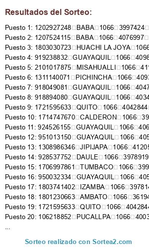 - Puesto 1: 1202927248 BABA 1066 3997424 6 982469244 982469244 36:35,2 RECARGAS 11 DIANA PILAR CORDOVA TRIVIÑO LOS RIOS SI 6,0