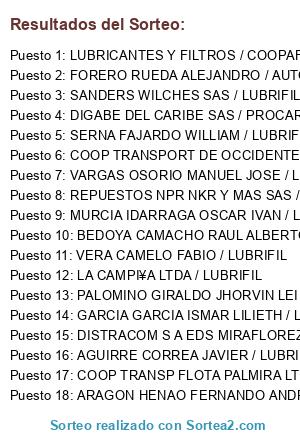 Lista de participantes: GRUPO EDS AUTOGAS S / COOPAFA, CP DIESSEL INTERNACIONAL / COOPAFA, LUBRICANTES Y FILTROS / COOPAFA, FORERO RUEDA ALEJANDRO / AUTOREP. BARRANQUILLITA / PROCAR TUBARA, ALVAREZ GONZALEZ ANTONIO LUIS / PROCAR TUBARA, DIGABE DEL CARIBE SAS / PROCAR TUBARA, SANDERS WILCHES SAS / LUBRIFIL, GARCIA GARCIA ISMAR LILIETH / LUBRIFIL, VERA CAMELO FABIO / LUBRIFIL, COOP TRANSPORT DE OCCIDENTE / LUBRIFIL, CERON OCHOA MAGNOLIA / LUBRIFIL, PALOMINO GIRALDO JHORVIN LEI / LUBRIFIL, DISTRACOM S A EDS MIRAFLOREZ / LUBRIFIL, VELASCO DANIEL/ESSO SAN MARI / LUBRIFIL, LA CAMPI¥A LTDA / LUBRIFIL, SERNA FAJARDO WILLIAM / LUBRIFIL, ARAGON HENAO FERNANDO ANDRES / LUBRIFIL, VARGAS OSORIO MANUEL JOSE / LUBRIFIL, COVATRANS LTDA / LUBRIFIL, MURCIA IDARRAGA OSCAR IVAN / LUBRIFIL, ALVAREZ VALENCIA CARLOS HUMB / LUBRIFIL, CLAVIJO RAMIREZ ANDRES FELIP / LUBRIFIL, COOP TRANSP FLOTA PALMIRA LT / LUBRIFIL, BEDOYA CAMACHO RAUL ALBERTO / LUBRIFIL, AGUIRRE CORREA JAVIER / LUBRIFIL, REPUESTOS NPR NKR Y MAS SAS / LUBRIFIL.