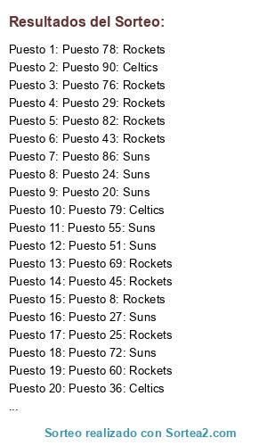 Lista de participantes: Puesto 1: Rockets, Puesto 2: Rockets, Puesto 3: Celtics, Puesto 4: Rockets, Puesto 5: Suns, Puesto 6: Rockets, Puesto 7: Celtics, Puesto 8: Rockets, Puesto 9: Suns, Puesto 10: Celtics, Puesto 11: Celtics, Puesto 12: Suns, Puesto 13: Rockets, Puesto 14: Rockets, Puesto 15: Rockets, Puesto 16: Celtics, Puesto 17: Celtics, Puesto 18: Rockets, Puesto 19: Suns, Puesto 20: Suns, Puesto 21: Rockets, Puesto 22: Celtics, Puesto 23: Rockets, Puesto 24: Suns, Puesto 25: Rockets, Puesto 26: Rockets, Puesto 27: Suns, Puesto 28: Celtics, Puesto 29: Rockets, Puesto 30: Rockets, Puesto 31: Celtics, Puesto 32: Suns, Puesto 33: Rockets, Puesto 34: Rockets, Puesto 35: Rockets, Puesto 36: Celtics, Puesto 37: Suns, Puesto 38: Suns, Puesto 39: Rockets, Puesto 40: Suns, Puesto 41: Celtics, Puesto 42: Rockets, Puesto 43: Rockets, Puesto 44: Celtics, Puesto 45: Rockets, Puesto 46: Suns, Puesto 47: Rockets, Puesto 48: Celtics, Puesto 49: Suns, Puesto 50: Suns, Puesto 51: Suns, Puesto 52: Rockets, Puesto 53: Celtics, Puesto 54: Rockets, Puesto 55: Suns, Puesto 56: Suns, Puesto 57: Celtics, Puesto 58: Suns, Puesto 59: Rockets, Puesto 60: Rockets, Puesto 61: Suns, Puesto 62: Suns, Puesto 63: Rockets, Puesto 64: Suns, Puesto 65: Suns, Puesto 66: Rockets, Puesto 67: Rockets, Puesto 68: Rockets, Puesto 69: Rockets, Puesto 70: Suns, Puesto 71: Rockets, Puesto 72: Suns, Puesto 73: Celtics, Puesto 74: Celtics, Puesto 75: Suns, Puesto 76: Rockets, Puesto 77: Suns, Puesto 78: Rockets, Puesto 79: Celtics, Puesto 80: Rockets, Puesto 81: Rockets, Puesto 82: Rockets, Puesto 83: Celtics, Puesto 84: Celtics, Puesto 85: Suns, Puesto 86: Suns, Puesto 87: Rockets, Puesto 88: Celtics, Puesto 89: Celtics, Puesto 90: Celtics, Puesto 91: Suns, Puesto 92: Rockets.