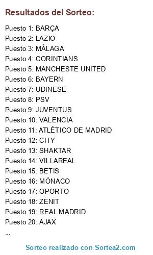 Lista de participantes: BARÇA, REAL MADRID, MANCHESTE UNITED, ATLÉTICO DE MADRID, VALENCIA, INTER, MÁLAGA, BETIS, AJAX, BAYERN, LAZIO, CORINTIANS, ALMERIA, SHAKTAR, BOCA, LYON, ZENIT, VILLAREAL, OPORTO, JUVENTUS, UDINESE, PSV, MÓNACO, CELTA, ELCHE, CITY.