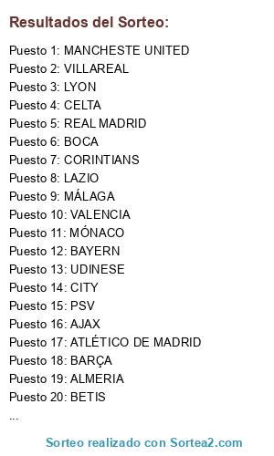 Lista de participantes: BARÇA, REAL MADRID, MANCHESTE UNITED, ATLÉTICO DE MADRID, VALENCIA, INTER, MÁLAGA, BETIS, AJAX, BAYERN, LAZIO, CORINTIANS, ALMERIA, SHAKTAR, BOCA, LYON, ZENIT, VILLAREAL, OPORTO, JUVENTUS, UDINESE, PSV, MÓNACO, CELTA, ELCHE, CITY.