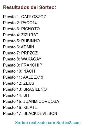 Lista de participantes: ADMIN, PICHOTO, PACO14, JUANMICORDOBA, CARLOSZGZ, BIT, AALEEX19, WAKAGAY, FRANCHIP, BLACKDEVILSON, KILATE, BRASILEÑO, PRPZGZ, ZEUS, ZIZURAT, RUBINHO, NACH.