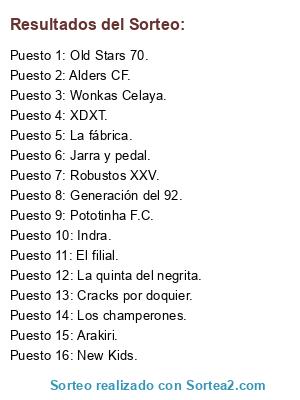 Lista de participantes: Jarra y pedal., La quinta del negrita., La fábrica., Arakiri., Los champerones., Wonkas Celaya., El filial., Cracks por doquier., Alders CF., Robustos XXV., Indra., New Kids., Generación del 92., Old Stars 70., XDXT., Pototinha F.C..