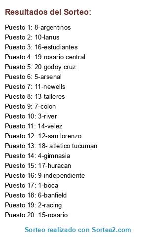 Lista de participantes: 1-boca, 2-racing, 3-river, 4-gimnasia, 5-arsenal, 6-banfield, 7-colon, 8-argentinos, 9-independiente, 10-lanus, 11-newells, 12-san lorenzo, 13-talleres, 14-velez, 15-rosario, 16-estudiantes, 17-huracan, 18- atletico tucuman, 19 rosario central, 20 godoy cruz.