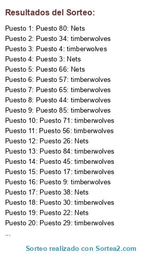 Lista de participantes: Puesto 1: timberwolves, Puesto 2: timberwolves, Puesto 3: Nets, Puesto 4: timberwolves, Puesto 5: timberwolves, Puesto 6: Nets, Puesto 7: timberwolves, Puesto 8: timberwolves, Puesto 9: timberwolves, Puesto 10: timberwolves, Puesto 11: timberwolves, Puesto 12: Nets, Puesto 13: timberwolves, Puesto 14: Nets, Puesto 15: timberwolves, Puesto 16: timberwolves, Puesto 17: timberwolves, Puesto 18: timberwolves, Puesto 19: timberwolves, Puesto 20: timberwolves, Puesto 21: timberwolves, Puesto 22: Nets, Puesto 23: Nets, Puesto 24: timberwolves, Puesto 25: timberwolves, Puesto 26: Nets, Puesto 27: Nets, Puesto 28: Nets, Puesto 29: timberwolves, Puesto 30: timberwolves, Puesto 31: timberwolves, Puesto 32: Nets, Puesto 33: timberwolves, Puesto 34: timberwolves, Puesto 35: timberwolves, Puesto 36: timberwolves, Puesto 37: Nets, Puesto 38: Nets, Puesto 39: timberwolves, Puesto 40: Nets, Puesto 41: timberwolves, Puesto 42: Nets, Puesto 43: timberwolves, Puesto 44: timberwolves, Puesto 45: timberwolves, Puesto 46: Nets, Puesto 47: Nets, Puesto 48: Nets, Puesto 49: timberwolves, Puesto 50: timberwolves, Puesto 51: timberwolves, Puesto 52: timberwolves, Puesto 53: timberwolves, Puesto 54: timberwolves, Puesto 55: Nets, Puesto 56: timberwolves, Puesto 57: timberwolves, Puesto 58: timberwolves, Puesto 59: timberwolves, Puesto 60: timberwolves, Puesto 61: timberwolves, Puesto 62: Nets, Puesto 63: Nets, Puesto 64: Nets, Puesto 65: timberwolves, Puesto 66: Nets, Puesto 67: Nets, Puesto 68: Nets, Puesto 69: timberwolves, Puesto 70: timberwolves, Puesto 71: timberwolves, Puesto 72: Nets, Puesto 73: timberwolves, Puesto 74: timberwolves, Puesto 75: timberwolves, Puesto 76: timberwolves, Puesto 77: timberwolves, Puesto 78: timberwolves, Puesto 79: timberwolves, Puesto 80: Nets, Puesto 81: Nets, Puesto 82: timberwolves, Puesto 83: Nets, Puesto 84: timberwolves, Puesto 85: timberwolves, Puesto 86: timberwolves, Puesto 87: Nets, Puesto 88: Nets, Puesto 89: Nets, Puesto 90: timberwolves, Puesto 91: timberwolves, Puesto 92: Nets, Puesto 93: Nets.