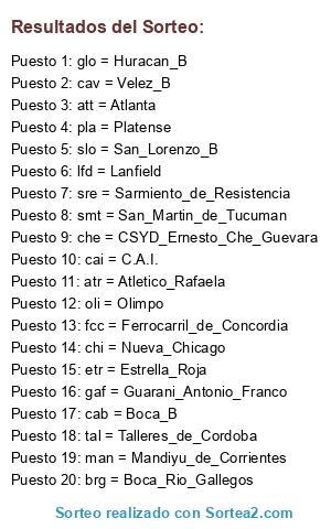 Lista de participantes: glo = Huracan_B, cab = Boca_B, cav = Velez_B, lfd = Lanfield, slo = San_Lorenzo_B, atr = Atletico_Rafaela, oli = Olimpo, smt = San_Martin_de_Tucuman, chi = Nueva_Chicago, che = CSYD_Ernesto_Che_Guevara, cai = C.A.I., tal = Talleres_de_Cordoba, gaf = Guarani_Antonio_Franco, sre = Sarmiento_de_Resistencia, etr = Estrella_Roja, brg = Boca_Rio_Gallegos, att = Atlanta, pla = Platense, fcc = Ferrocarril_de_Concordia, man = Mandiyu_de_Corrientes.