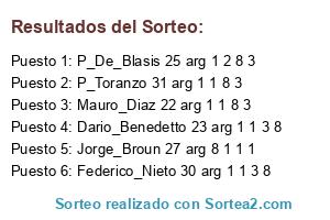 Lista de participantes: Jorge_Broun 27 arg 8 1 1 1, P_De_Blasis 25 arg 1 2 8 3, P_Toranzo 31 arg 1 1 8 3, Mauro_Diaz 22 arg 1 1 8 3, Dario_Benedetto 23 arg 1 1 3 8, Federico_Nieto 30 arg 1 1 3 8.