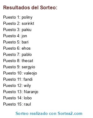 Lista de participantes: Naranjo, pablo, pakiu, ehos, sorinkt, lobo, jon, wily, bari, sergyio, fandi, raul, valeojo, thecat, poliny.