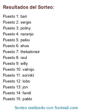 Lista de participantes: naranjo, pablo, ehos, pakiu, lobo, jon, willy, bari, sorinkt, sergio, fandi, raul, valrojo, thekatoneir, poliny.