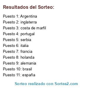 Lista de participantes: Argentina, brasil, españa, italia, inglaterra, costa de marfil, holanda, francia, alemania, portugal, serbia.