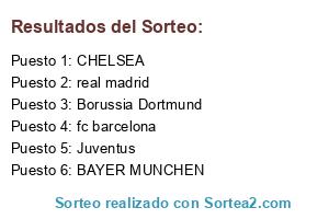 Lista de participantes: fc barcelona, real madrid, Borussia Dortmund , BAYER MUNCHEN , Juventus , CHELSEA , .