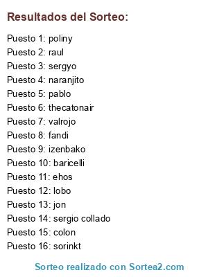 Lista de participantes: baricelli, lobo, poliny, sorinkt, fandi, colon, pablo, naranjito, valrojo, raul, sergio collado, sergyo, ehos, thecatonair, izenbako, jon.