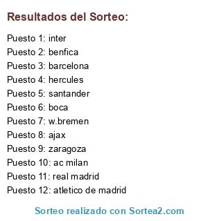 Lista de participantes: barcelona, benfica, inter, w.bremen, zaragoza, real madrid, ajax, ac milan, santander, atletico de madrid, hercules, boca.