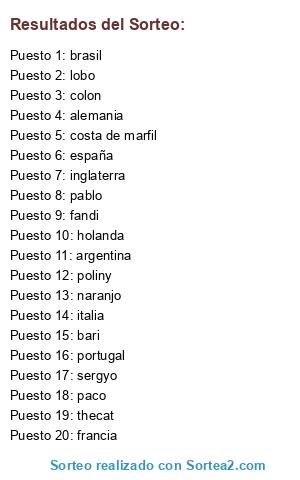 Lista de participantes: thecat, poliny, sergyo, bari, colon, fandi, pablo, naranjo, lobo, paco, brasil, italia, inglaterra, costa de marfil, alemania, holanda, francia, españa, argentina, portugal.