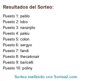 Lista de participantes: thecatonair, colon, baricelli, pakiu, lobo, poliny, naranjito, pablo, fandi, sergyo.
