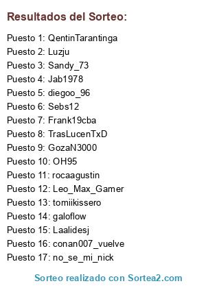 Lista de participantes: Sebs12, QentinTarantinga, TrasLucenTxD, GozaN3000, Sandy_73, Leo_Max_Gamer, rocaagustin, OH95, no_se_mi_nick, diegoo_96, djmix56, Frank19cba, Luzju, tomiikissero, Laalidesj, Jab1978, conan007_vuelve, galoflow.