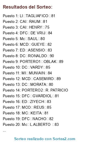 Lista de participantes: PORTERO1 OBLAK 89, PORTERO2 R. PATRICIO 82 82, DFC GVARDIOL 81, DFC DE VRIJ 84, DFC NACHO 82, LI TAGLIAFICO 81, CAI RAUM 81, CAI HENRY 75, MCD CASEMIRO 89, MCD GUEYE 82, MC KEITA 81, Mc SAUL 80, MD SAKA 82, MI MUNIAIN 84, Mc L.ALBERTO 83, MCO REUS 85, ED ZIYECH 83, ED ASENSIO 83, DC MORATA 80, DC VARDY 85, DC RONALDO 90.