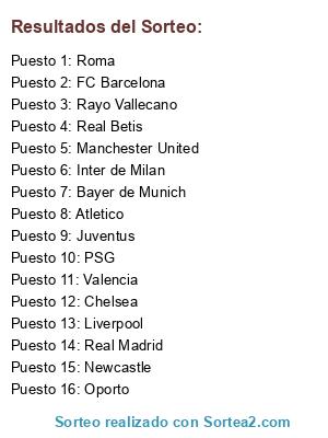 Lista de participantes: Atletico, Valencia, Real Betis, Rayo Vallecano, Inter de Milan, Newcastle, Chelsea, FC Barcelona, Real Madrid, Bayer de Munich, Liverpool, Oporto, Juventus, Roma, PSG, Manchester United.