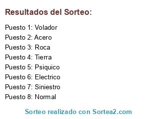 Lista de participantes: Planta , Bicho, Electrico, Normal, Lucha, Volador, Dragon, Siniestro, Fantasma, Acero, Hielo, Fuego, Tierra, Roca, Psiquico, Veneno.
