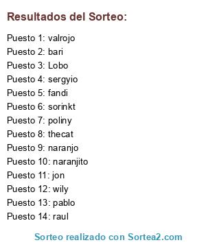 Lista de participantes: Lobo, bari, sergyio, naranjo, pablo, raul, poliny, valrojo, sorinkt, wily, naranjito, thecat, fandi, jon.