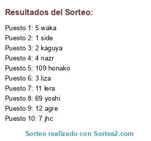 Lista de participantes: 1 side, 2 kaguya, 3 liza, 4 nazr, 5 waka, 19 rachel, 7 jhc , 109 honako, 69 yoshi, 11 lera, 12 agre, .