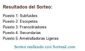 Lista de participantes: Subfusiles, Escopetas, Francotiradores, Ametralladoras Ligeras, Secundarias.