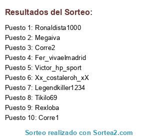 Lista de participantes: Tikilo69, Fer_vivaelmadrid, Legendkiller1234, Megaiva, Rexloba, Ronaldista1000, Xx_costaleroh_xX, Victor_hp_sport, Corre1, Corre2.