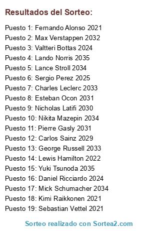 Lista de participantes: Lewis Hamilton 2022, Valtteri Bottas 2024, Max Verstappen 2032, Sergio Perez 2025, Carlos Sainz 2029, Charles Leclerc 2033, Daniel Ricciardo 2024, Lando Norris 2035, Fernando Alonso 2021, Esteban Ocon 2031, Sebastian Vettel 2021, Lance Stroll 2034, Pierre Gasly 2031, Yuki Tsunoda 2035, Kimi Raikkonen 2021, George Russell 2033, Nicholas Latifi 2030, Mick Schumacher 2034, Nikita Mazepin 2034.