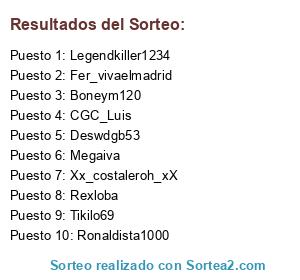 Lista de participantes: Tikilo69, CGC_Luis, Deswdgb53, Fer_vivaelmadrid, Legendkiller1234, Megaiva, Rexloba, Ronaldista1000, Xx_costaleroh_xX, Boneym120.