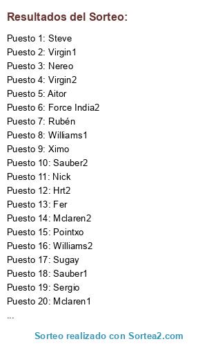 Lista de participantes: Nick, Fer, Ximo, Rubén, Steve, Barategui, Perilla, Aitor, Sugay, Pointxo, Nereo, Sergio, Force India1, Force India2, Mclaren1, Mclaren2, Virgin1, Virgin2, Hrt1, Hrt2, Williams1, Williams2, Sauber1, Sauber2.