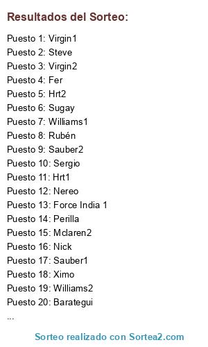 Lista de participantes: Nereo, Sugay, Barategui, Pointxo, Fer, Sergio, Steve, Nick, Perilla, Rubén, Ximo, Mclaren1, Mclaren2, Virgin1, Virgin2, Sauber1, Sauber2, Hrt1, Hrt2, Force India 1, Williams1, Williams2.