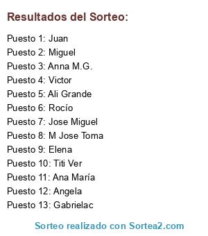 Lista de participantes: Titi Ver, Aroa, Jose Castillo, Monika, Angela, M Jose Toma, Vanesa Ferrer, Sonia Rabadan, Isabel, Anna M.G., Rocío, Sheyla Martinez Pla, Natalia, Concepción Gómez, Elena, Norita Morando, Voctoria, Susana, Julie, Carmina García, Victor, Jessi M., Miguel, Frikimami, Juan, Raquel, Ali Grande, Tururu, Teresa, Juana, Jose Miguel, Cristina Villar, Angela Jimenz Garcia, Miguel Merino Muñoz, Gabrielac, Ana María, Núria Garcia, Marta Sancho, Patricia, Veronica, Cruz Nieto.