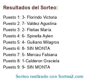 Lista de participantes: 1-Calderon Graciela, 2- Fleitas María, 3- Florindo Victoria, 4- Guiliano Milagros, 5- Mercau Fabiana, 6- Spinella Aylen, 7- Valdez Agustina, 8- SIN MONTA, 9- SIN MONTA.