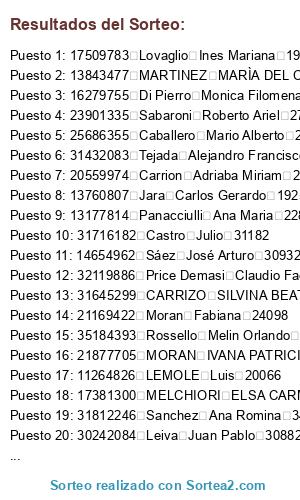 Lista de participantes: 25723795 D AGUSTINO Gabriela Fernanda 28991, 23596285 Romagnoli Claudio Marcelo 29009, 32474359 Ortiz Gisela Susana 34883, 26524882 Bordon Luciana jaquelina 28931, 31286463 Fernandez Valentina 31008, 31786794 MARTÍNEZ MARÍA LAURA 31047, 24207732 Carrizo Veronica Margarita 28925, 30972688 Salvo Valentina 32864, 14311036 Quiroga Sergio 21601, 16256240 Guerra Alejandro 23689, 20220713 Loyero Andrea Yolanda 28855, 27090756 Mella Ortiz Daniela Alejandra 31526, 23159330 Piacentini Maria Celeste 33825, 13035134 Gimenez Rubén oscar 19748, 34355539 ARROYO Mariana Yanina 32568, 30510351 Contursi David 34313, 20809152 SCALZO Pablo David 24158, 27362471 MALDONADO SABINO RAÚL 30135, 31902547 Tornello Pablo 28988, 39088159 Montenegro Camila María Belén 34158, 39800144 LUCERO ZULUAGA Manuela 34159, 14607685 Gebarski Ricardo Gabriel 31202, 17295009 Estrada Domingo 26385, 27785025 Knoll Enriqueta 27121, 38416412 CISTERNA MARIA VICTORIA 34923, 22903037 Morales Alberto Eugenio 28729, 31546014 Bermejillo Claudia Mariel 30725, 29340844 Luquez Estefania 28694, 13149171 Bermejo Zulma Teresita 30451, 24442211 Sosa Ivana E. 27545, 26838216 Egea Jose 28766, 29834834 Ortiz Martín Nicolás 28989, 32085679 Guayco Analía Belén 31708, 26349999 Derra MARIA NATALIA 33772, 33052784 Sarmiento Maria Belen 33947, 26747968 Rosales Carla Daniela 27277, 25589201 Villar Maria del Valle 28506, 16115655 Estrada Gladys Sandra 20280, 16038219 Rio Cecilia 23445, 31546798 Di Pasquale Ana 33133, 27519399 Strafile Sabino Gerardo 31854, 24232064 Henriquez Eliana Fernanda 33147, 25533892 Ycuza Verónica Lorena 27834, 33008056 Fernández Fernanda Natalia 31853, 30242084 Leiva Juan Pablo 30882, 24566134 Alvarez Hugo 29905, 16277854 Marinero Marta Victoria 25896, 24192816 DIAZ ANABEL 30299, 16868269 Zahn Erika 20048, 26245152 Campos Maria Elena 30559, 30510408 Silioni Maria laura 31199, 31432083 Tejada Alejandro Francisco 30025, 22903200 Gómez María Alejandra 23766, 29222803 Martinez Federico 28957, 33821316 Magallanes Gisel 31846, 29148700 Guzman Maria Teresa 29834, 36134539 Albornoz Farías Sabina Rita 32534, 24033092 Rey Juan Gustavo 26846, 30987302 Marti Peña Maria agustina 30988, 38907699 MALLIMA Alvaro Nicolás 32263, 16720022 Chirino Alejandro Ricardo 20842, 23926409 Simonsini Andrea Carolina 27026, 33801192 Garro Ferrabdo Juan manuel 31105, 35133466 Vargas Andrea 32258, 35553149 Ferraro Tornello Lucas Carlos Enrique 31836, 22857153 Albaladejo Luella Adriana 24823, 17573122 Muscolini Sandra Verónica 20776, 30536450 Oliva Victor 31830, 22788597 Antón Araceli 25523, 20116827 Dei tos Sandra Marcela 19305, 24866005 Tudela Marcelo Raúl 29060, 34461091 Moreno Romano Maria Florencia 32031, 92500348 Rissotto Carina 33687, 13425345 RODRÍGUEZ Gustavo Jesus Alfredo 15447, 27369649 Grosso Dario Salvador 32323, 14667812 Montero Jorge Roberto 21510, 20113047 Vargas Miriam Susana 19932, 16588898 ABDO Alfredo David 19066, 17410570 Escudero Stella Maris 21176, 17768596 ILLESCA MARIANA MÓNICA 20201, 22625556 Passalacqua Paula 32643, 29537997 Postizzi Daniel 33788, 30343983 Morales Johanna Alejandra 28767, 30446073 Fernández Cataldo Ricardo Damián 34735, 31286102 Salinas Pizarro Pamela yanel 31063, 27740407 Cruz Maria Laura 28055, 37002300 Rodriguez Costantino Joaquin Alfonso 34796, 31432120 Vasquez María Laura 30933, 35514830 GAIDO Giovanna Alessandra 33658, 14149298 Peretti Ester Elizabeth 21578, 40373026 Correnti Matias 33335, 27101624 Fernandez Daniela Paola 32646, 20304140 GONZALEZ SONIA GABRIELA 19941, 27596445 Bustos Lira Yemina Carolina 28541, 11264826 LEMOLE Luis 20066, 24701601 Cotifane Mariela Fabiana 32480, 16861805 Arancibia Laura Esther 20713, 26738418 Adrover Juan Carlos 26396, 14471184 Caniggia Claudia 19599, 28893180 Ruggeri Eliana Paola 30974, 30536946 Ballesteros Dulce María 34899, 20449852 Pernicce Lina Beatríz 22669, 29372725 DIAZ JAVIER HORACIO 29805, 27874943 Seebeock Heber 31703, 30274882 Fernandez Kaul Mariangeles 31690, 28162468 Rey Jeronimo Rodrigo 28104, 34322856 Soria Galvarro Cruz Eslem Jaled 34613, 29916691 Vergara Jose antonio 31933, 30440384 Esnaola Mauro Ignacio 31183, 39679226 Molina señio Facundo Neyen 32262, 35184393 Rossello Melin Orlando 33289, 37002590 Pietrobon Giuliana 34909, 20983022 Agüero Candia Luis Mariano 31545, 38759697 Villatoro Abril 31889, 34854076 funes damian 32000, 39242585 AMICO NICOLAS EXEQUIEL 35222, 17084009 Zervos Nicolas 23399, 40788041 SÁEZ SIMÓN Guadalupe 35058, 22131880 Cuccia Sandra Analía 24931, 29386389 Mattar Marcos 30150, 32085552 Rodriguez María Gisel 31562, 29056806 López Romboli María Soledad 35129, 28382629 Yarzabal Soledad 30287, 35512246 IBACETA Marcela Johana 34285, 26838046 ARANGO JUAN PABLO 28575, 16279755 Di Pierro Monica Filomena 22206, 34626691 Camacho Anahí Monserrat 33656, 32377274 Herrera calderon Guido andres 30137, 22872183 Gallardo Martinez Mario Andres 30553, 20896632 BUSTOS Roxana Andrea 33686, 16011741 Gutierrez Omar 21999, 33168017 Farina Stella Maris 31917, 17573104 Ventura Miguel Angel 22488, 18840309 Bay María Paula 31533, 25353288 Eula Sebastian 28983, 33631884 chacon johana 30543, 17640772 GARCIA NICOLAS ANTONIO 22723, 26828162 Cantos Verasay Mario Alberto 33669, 14524973 Giolo Hugo Alberto 31992, 36814700 Buttazzoni Ornella Abril 33385, 31770837 Robazza Diego 31060, 36581770 Aloi Germán 33704, 22136087 Colucci Fabiana Andrea 31066, 23386160 Cotar Carmen Andrea 24269, 17381300 MELCHIORI ELSA CARMEN 23508, 17373470 Muñoz Nélda 28995, 25292204 Vazquez Analia Elcira 34925, 32627501 Lucero Evelyn 31187, 32193880 Rodríguez Mariné 30998, 24413985 Vilches Mauricio 32022, 36340959 Garay Juan Gabriel 33290, 33275638 CASTRO SILVA ANDRÉS RODRIGO 28987, 34774494 MARTIN Matias Ezequiel 31311, 38475854 Pena Ariadna Mariel 34662, 29614360 Rinaldo Jorge Adrian 28731, 14041352 BARBIERI LIVIO 26999, 34676990 Menchón Mauro Adrián 34614, 33577312 PESSINA Nelson Román 31558, 31546727 MIRANDA Johana Vanina 31430, 29