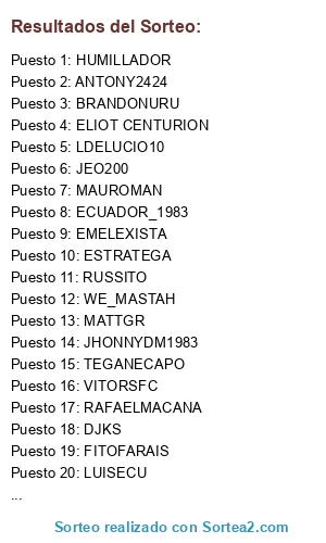 Lista de participantes: EMELEXISTA, VITORSFC, ANTONY2424, TATUMANYA, FITOFARAIS, HUMILLADOR, HECTORSCS, TORAMATSU, JEO200, ESTRATEGA, MATADERO2015, LDELUCIO10, LUIS-SC-10, TONY, BRANDONURU, ECUADOR_1983, LUISECU, ELIOT CENTURION, TEGANECAPO, MATTGR, RUSSITO, DJKS, MAUROMAN, JHONNYDM1983, RODRI271, KIKESJ, CHILA, RAFAELMACANA, WE_MASTAH, HAIDER1223, RAFINHA, LUIS0303.