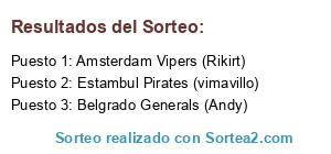Lista de participantes: Belgrado Generals (Andy), Manchester Red Devils (Mendisala), Roma Senators (iagoming), Amsterdam Vipers (Rikirt), Varsovia Ice Tigers (JSBM), Estambul Pirates (vimavillo).