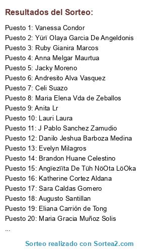 Lista de participantes: Les Mimi, Yosselyn Cabrera Bernales, Cinthya De Salas, Tania Huamán Reyes, Mario J. Pedemonte, Carmela Fernandez, Jans León, Mirella Rojas, Christian Leon, Daniela Tordoya, Jenny Moreno, Jacky Moreno, Renzo Sebastian Boyd, Marie, Diego Sanchez Ortiz, Andrea Vásquez De Velasco Arroba, Samantha Veliz, Zoraida Montes, Maritza Olivares, Juan Aron, Xiomara Licuona, Vanedy Coral Perez Davila, Consuelo Moncada, Carlos Luque Valenzuela, Giovana Julyy, Ebony Licuona(2 participaciones), Karen Bautista, David Rayo, Omar De Los Santos, Luisa Toyofuko, Israel Zegarra Pineda, César Castillo Jr., Giovanny D Ramirez, Ysabel Ventura, Yelenit Quiñones Rodriguez, Pilar Cornejo Quintana, Israel Ramos Robalino, Celi Suazo, Celeste Mendoza, Nelia R-Flores, Manuel Caballero, Treysi Mozombite, Valentina Maria Calderon Gonzales, Bernardita Salvatierra, Katty Lopez Loayza, Mary Zeballos, Angellie Caes, Juan Lira, Loco Mix, Wendy ZR, Maria Elena Torres Ibertis, Milenka Avril, MaLu Pantoja, Virna Medina Chara, Laura Garcia, Alicia Herencia Ortega, Garcia Alberto, Fabiola Amaranta, Chavely Crish Caceres Boza, Ernesto Málaga Kinosita, Lisseth Prieto, Myriam Sg, Luigi Carozzi, Thalia Paredes, Elizabeth Sulca Flores, Angela Beramendi Acosta, Juan Carlos, Alexander De Los Rios, Isabella Corzo Bacon, Rosario Garcia Sanchez, Katherine Cortez Aldana, Mrosa Monroe, Marilia Tejeda Figueroa, Liliana Mena, Yoselin Andrea Huapaya Capcha, Augusto Santillan, Mvmiz U Chorrillos, Stf Sanchez, Lauri Laura, Diana Ramirez, Eugenia Romero, Milagros Isabel Gamarra Huaman, Elena Rosa Santillan Rodriguez, Andrea Mendoza, Jackeline López Campos, Rosa Valiente, Vikita RM, Garcia Gutierez Aldair, July Leon, Ejuan Vargas, JoseLuis Valiente Santillan, Gustavo Espinoza, Irmita Valencia, Helena León, Claudia Atocha, Carlos Lopez, Fiorella Quiroz Valdivia, Maria Lp, Lu Valverde, Sofia Pullo Mitma, Anita Lr, Mónica Morales López, Nazareth Pretell, Guimell Pretell Calderón, Gonzalo Quiroz, Orlando Marin, Jhonathan Clemente, Carla Mayandia, Anyi Lopez, Kary Guadalupe Mesía Tirado, Jazmin Sanchez, Karla Yalta Manrique, Maddie Dyre, Karen Guisella Cruz Diaz, Victoria VB, Paola Ladera, Tomas Alberto Garcia Puente-arnao, Fiorella Aracely Quispe Hurtado, Patty Urbina BEramendi, Lisseth Del Alcazar Gonzales, Omar DP, Erika Roxana Hinostroza Leguia, Ernesto Malaga Burga, Alli Gi, Carmelita Aliaga Tomasini, Clarabel Bautista, Aldo Beraun Torres, Rosario Lanazca, Oscar Salazar, Cintya Barrientos, Marisol Beatriz, Luisa Quiñones, Eduardo Palacios, Rocio Ramirez, Enrique Ramirez, Katiuska A Osorio, Enrique Alberto Neyra Guerrero, Grazzia Salinas, Rosa Pachas Burga, Andrés Gleiser Tealdo, Violeta Felicita Sandmann Diaz, Maritza Fernandez Urribarri, Andrea Towers, Jesus Rocio Salazar Cabezas, Milu Alegre, Jacky Lira, Ciro Vasquez Palomino, Paolo Guerrero, Oscar Cepeda Salazar, Ântöny Machuca Aliaga, Leyla Jauregui Montalvo, Paty Vau, Lydia Vega, Brenda Guevara, Ketty Jauregui, Cls Valerie, Victor Eduardo Villafuerte Robles, J Pablo Sanchez Zamudio, Anna Melgar Maurtua, Vanessa Leona, Isa Sanchz, Ana Aniithaw, Mariieliita Flores, Lucero Rios Flores, Loana Ancha Olive, Raul Fernando Santillan Tuesta, Conchito Lequerica U, Fiorella Ramos Tagle, Toto Mansilla, Elizabeth IL, Vanessa Condor, Noelia León, Jimmy Ramirez, Lesli Cornejo, Greysi Quiñones Rivas, Bruno Elera Baigorria, Modey Pardo, Vargas Vrbina E Edu, Vasco Alonso, Isabella CQ, Luz Mercedes Palus Gaviria, Maria Elena Vda de Zeballos, Alberto Vicente A. Bravo, Khya Aguilar, Perla de Díaz, Mari Cerdan, Diaz Leslie, Vanessa Robles, Carla Centti, Luvi Vincent, Viko Pineda, J Piero Aragón Zelayaran, Ari Medrano, Eliana Carrión de Tong, Corilu Diaz Garcia, Harumi Villanueva, JC DE Cinthia, Patty Nataly Castillo Hurtado, Cristian Chamuly Vasquez, Maryori Acosta Camargo, Abelito Vargas Ramon, Jennifer Corrales Granda, J Esthefano Gonzales, Viviana Estrada López, Annabel Maria Eliza Chambilla, Stalin Ed Contreras Came, Medaly Mrc, Alexander Asto Ramos, Danilo Jeshua Barboza Medina, Karla Salazar, Junior Correa Molleda, Angie R'd, Anabel Karina Romero Velasquez, Oscar Sneijder Sangama, Melissa Rodrigues, Marybel Quequejana, Jossie Briigite, Cristhian Antonio Lindo Bravo, Rene Genaro Cerna Arevalo, ZimPlemente Anahii, Maria Pia Anda Vassallo, Cristiancito Cabrera, Jorge Jhonny Crisanto Nima, Daniela Nicole, Ashe Bvb, Ariana Joisy Ganoza Gutierrez, Emmita Salazar, Yürï Olaya Garcia De Angeldonis, Bhellaly De La Cruz Jimenez, Ruby Gianira Marcos, Nicole Medrano Gutiérrez, Jose Maria Villon, Maria Gracia Muñoz Solis, Gianella Avendaño Lopez, Marïa Lï Chen, Rosalinda Villarreal, Blankita Gaube, Johnny Rios, Maggie Diaz Garciaa, Evelyn Milagros, Adriana Orbegoso Effio, Angela Ureta Flores, Deboriita Panduro Peña, Irene Del Rosario Torres Solis, Andrea Vargas, Rosa Benites Soldevilla, Katherine Andrea Sumarriva Escajadillo, Anthony T'l RottBoy, Shirley Mercedes Castañeda Zea, Dania Carbajal, Mayte Genoveva Mozombite Gonzales, Diana Villegas, Danny Bruno Moreno Dominguez, Larry Thu Lokitho Gonzales Salazar, Brandon Huane Celestino, Itzel Rosales Gallardo, Francescoli Blanco Rojas, Claire Salvatore Arias, Angïezïïta De Tüh NöOta LöOka, Diego Alfonso Lopez Santillan, Sebastian Rodriguez Enriquez, Brenda Mendoza, Denilson Giovanni Sante Aylas, Bianquita Chung Valencia, Joel Vilchez Quiroga, Brenda Lisseth Osis Carrasco, Eric M. Panduro, Deysi Ramirez, Sara Caldas Gomero, Carlos Putpaña Ahuanari, Victor Dominguez Valdivia, Noemixita Martinez, Izune Tusk Uchiha, Biiankiitha Miireyiitha, Jessica Nathaly Hirohuay Rojas, Rodollfiitho Chancharii, Jackeliine Velasquez, Nayeli Calla, Sharon Alissa Camacho, Bill Fernandez Peve, Miinju Alvarado Zuñiga, Vicky Fernandez, Allyson Angel Gamarra Jimenez, Manuel Hernan Salazar Paico, Leydi Elizabeht Puerta, Cordova Coral Cindy Tatiana, Anyer Soto, Luz Clarita Ortiz, Wilson Vasquez Villegas, Perlita Campos Mozombite, Jhoselin Valeri