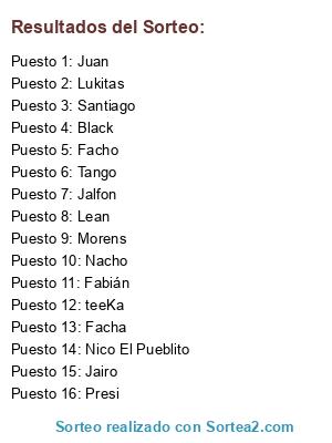 Lista de participantes: Lukitas, Nico El Pueblito, Jairo, teeKa, Morens, Tango, Facha, Santiago, Fabián, Presi, Jalfon, Facho, Black, Juan, Lean, Nacho.