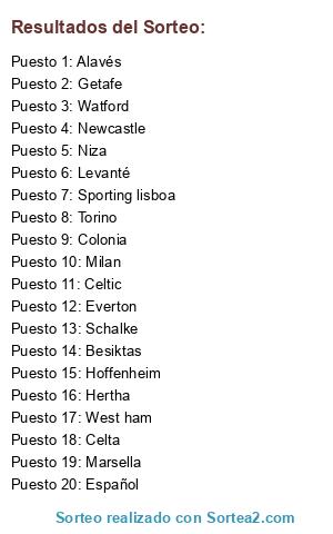 Lista de participantes: Schalke, Hertha, Hoffenheim, Wolfsburg, Colonia, Brujas, Celtic, Celta, Alavés, Getafe, Real sociedad, Levanté, Español, Mónaco, Lille, Marsella, Lyon, Niza, Rennes, Psv, Crystal Palace, Everton, Newcastle, Watford, West ham, Wolves, Fiorentina, Milan, Sampdoria, Torino, Sporting lisboa, Besiktas, Galatasaray, Basaksehir.