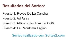Lista de participantes: Atlético San Pancho OSM, Reyes De La Cancha, La Penúltima Legión, Ad Astra.