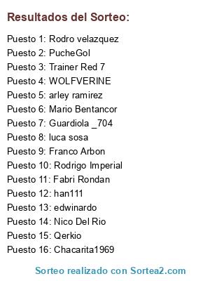 Lista de participantes: Trainer Red 7, Rodrigo Imperial, edwinardo, Fabri Rondan, Qerkio, Chacarita1969, han111, WOLFVERINE, luca sosa, Guardiola _704, Rodro velazquez, PucheGol, arley ramirez, Franco Arbon, Nico Del Rio, Mario Bentancor.