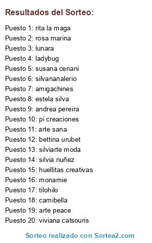 Lista de participantes: amigachines, andrea pereira, arte sana, bettina urubet, camibella, estela silva, huellitas creativas, ladybug, lunara, monamie, pi creaciones, rita la maga, rosa marina, silvananalerio, silvia nuñez, silviarte moda, susana ceriani, tilohilo, viviana catsouris, arte peace.