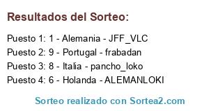 Lista de participantes: 1 - Alemania - JFF_VLC, 2 - Argentina - abundi, 3 - Brasil - aleman_18, 4 - España - CARLANGA_FCB1889, 5 - Francia - poty23, 6 - Holanda - ALEMANLOKI, 7 - Inglaterra - Maikel, 8 - Italia - pancho_loko, 9 - Portugal - frabadan, 10 - Rusia - DAVIDBLAKI, 11 - Uruguay - zipinho_7, 12 - Camerún - pakinho, 13 - Suecia - pesadajo, 14 - Croacia - jaimond, 15 - Mexico - guillem93, 16 - Turquia - oscardisu.