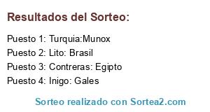 Lista de participantes: Adri: Grecia, Contreras: Egipto, Fran: Dinamarca, Inigo: Gales, Rocha: Camerun, Oskis: España, Lito: Brasil, Ruben: Holanda, Pedrete: Belgica, RubenyYuri: Francia, Suecia:Corpa, Uruguay:Calvente, Chile:Zizou, Turquia:Munox, Costa de Marfil:Poti.