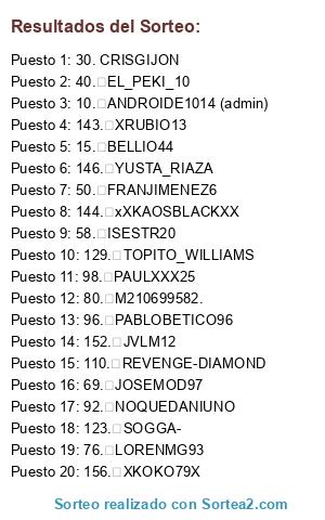 Lista de participantes: 10. ANDROIDE1014 (admin), 15. BELLIO44, 20. CANILLEJO, 22. CASOL944, 24. CHERCHIRRACING, 29. CORTECERO11, 30. CRISGIJON, 40. EL_PEKI_10, 41. ELPELODEUNHUEVO, 44. ENLOVE181, 50. FRANJIMENEZ6, 58. ISESTR20, 69. JOSEMOD97, 71. JUANKAR5, 76. LORENMG93, 80. M210699582., 89. NEODUKE9, 92. NOQUEDANIUNO, 96. PABLOBETICO96, 98. PAULXXX25, 104. POL10CRAC, 110. REVENGE-DIAMOND, 117. SANTYKY97, 123. SOGGA-, 127. STFANO0424, 129. TOPITO_WILLIAMS, 139. WHITEMIRE, 143. XRUBIO13, 144. xXKAOSBLACKXX, 146. YUSTA_RIAZA, 152. JVLM12, 156. XKOKO79X.