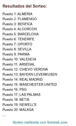 Lista de participantes: INTER MILAN, FLAMENGO, ALMERIA, VALENCIA, MANCHESTER UNITED, OPORTO, BAYERN LEVERKUSEN, PARMA, BARCELONA, MALAGA, LAS PALMAS, REAL MADRID, CHIEVO VERONA, DEPORTIVO CORUÑA, BETIS, SEVILLA, GIRONA, ARSENAL, ALCORCON, TENERIFE, BENFICA, ATLETICO MADRID, NEWELL'S, PSG.