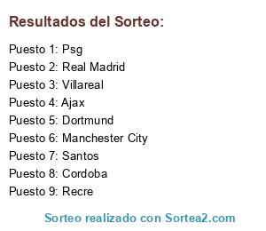 Lista de participantes: Ajax, Villareal, Santos, Psg, Real Madrid, Cordoba, Manchester City, Dortmund, Recre.