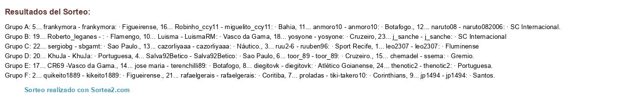 Lista de participantes: 1... leo2307 - leo2307: · Fluminense, 2... quikeito1889 - kikeito1889: · Figueirense., 3... ruu2-6 - ruuben96: · Sport Recife, 4... Salva92Betico - Salva92Betico: · Sao Paulo, 5... frankymora - frankymora: · Figueirense, 6... toor_89 - toor_89: · Cruzeiro., 7... proladas - tiki-takero10: · Corinthians, 8... diegitovk - diegitovk: · Atlético Goianense, 9... jp1494 - jp1494: · Santos., 10... Luisma - LuismaRM: · Vasco da Gama, 11... anmoro10 - anmoro10: · Botafogo., 12... naruto08 - naruto082006: · SC Internacional., 13... cazorliyaaa - cazorliyaaa: · Náutico., 14... jose maria - terenchilli89: · Botafogo, 15... chemadel - ssema: · Gremio., 16... Robinho_ccy11 - miguelito_ccy11: · Bahia, 17... CR69 Vasco da Gama., 18... yosyone - yosyone: · Cruzeiro, 19... Roberto_leganes - : · Flamengo, 20... KhuJa - KhuJa: · Portuguesa, 21... rafaelgerais - rafaelgerais: · Coritiba, 22... sergiobg - sbgamt: · Sao Paulo., 23... j_sanche - j_sanche: · SC Internacional, 24... thenotic2 - thenotic2: · Portuguesa..
