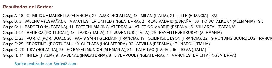 Lista de participantes: 1 BARCELONA (ESPAÑA), 2 REAL MADRID (ESPAÑA), 3 VALENCIA (ESPAÑA), 4 ATLETICO MADRID (ESPAÑA), 5 VILLAREAL (ESPAÑA), 6 MANCHESTER UNITED (INGLATERRA), 7 MANCHESTER CITY (INGLATERRA), 8 LIVERPOOL (INGLATERRA), 9 ARSENAL (INGLATERRA), 10 CHELSEA (INGLATERRA), 11 TOTTENHAM (INGLATERRA), 12 JUVENTUS (ITALIA), 13 MILAN (ITALIA), 14 INTER (ITALIA), 15 ROMA (ITALIA), 15 LAZIO (ITALIA), 17 NAPOLI (ITALIA), 18 OLIMPIQUE MARSELLA (FRANCIA), 19 OLIMPIQUE LYON (FRANCIA), 20 PARIS SAINT GERMAIN (FRANCIA), 23 PORTO (PORTUGAL), 24 BENFICA (PORTUGAL), 25 SPORTING (PORTUGAL), 26 PSV (HOLANDA), 27 AJAX (HOLANDA), 28 FC BAYER MUNICH (ALEMANIA), 29 BAYER LEVERKUSEN (ALEMANIA), 31 PALERMO (ITALIA), 32 SEVILLA (ESPAÑA), 21 LILLE (FRANCIA) S/J, 22 GIRONDINS BOURDEOS FRANCIA) S/J, 30 FC SCHALKE 04 (ALEMANIA) S/J.